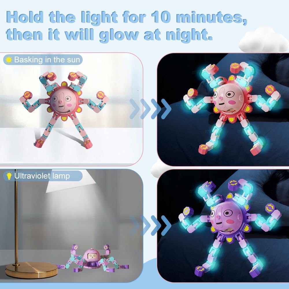 Transformable Shapes: Experience endless possibilities with our shape-shifting fidget spinners! These innovative fidget toys can morph into different forms based on your imagination, providing hours of hands-on fun. Built-in light-absorbing adhesive strip, irradiation of light for a period of time can be issued at night cool luminous effect