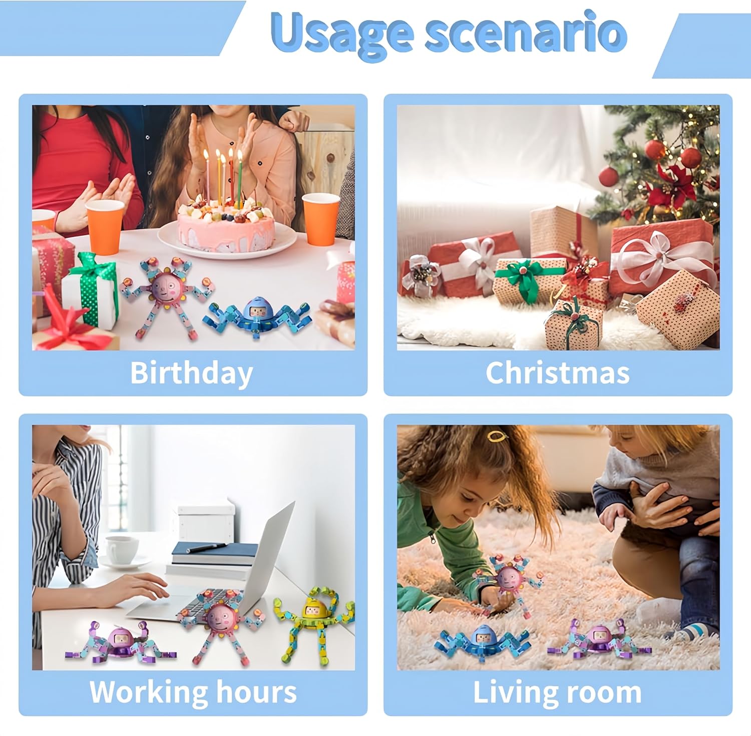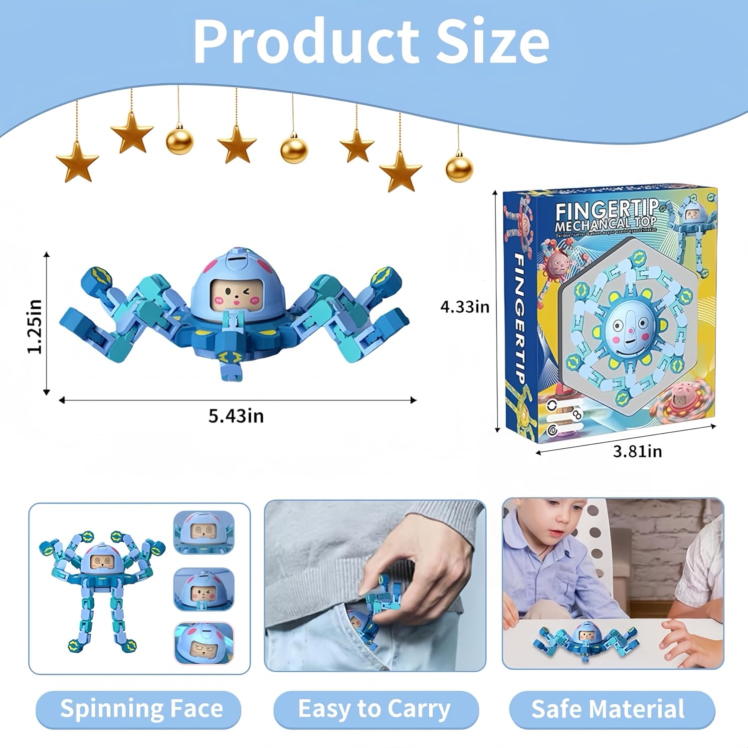 Fun Fidget Spinners: Dive into a world of creativity with our fidget spinners. Available in 5 vibrant colors, each spinner features 6 transformable chains and 3 adorable switchable expressions, allowing you to create cool shapes or even a handy phone stand